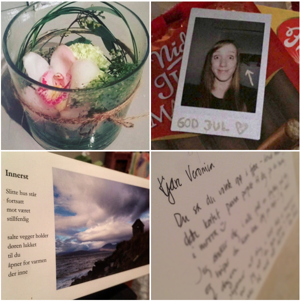 Noe som også kom på døra, var en blomst! Da følte jeg meg jaggu voksen et sekund. En av de andre gavene var et polaroid kamera, som gjorde at jeg kunne legge ved en vakker selfie i en av årets julegaver. Det aller siste jeg åpnet, og som rørte finnmarkshjertet mitt aller mest, var et kort. Det hadde et bilde fra nord, et dikt, og fine håndskrevne ord. Jeg tror nok tanken om at kortet kom fra en ansatt, som ikke lengre jobber på “min” gruppe engang, var ekstra rørende. Disse menneskene skal jo i grunn bare gi meg en tanke når de er på jobb, så jeg syns det var utrolig fint gjort.
