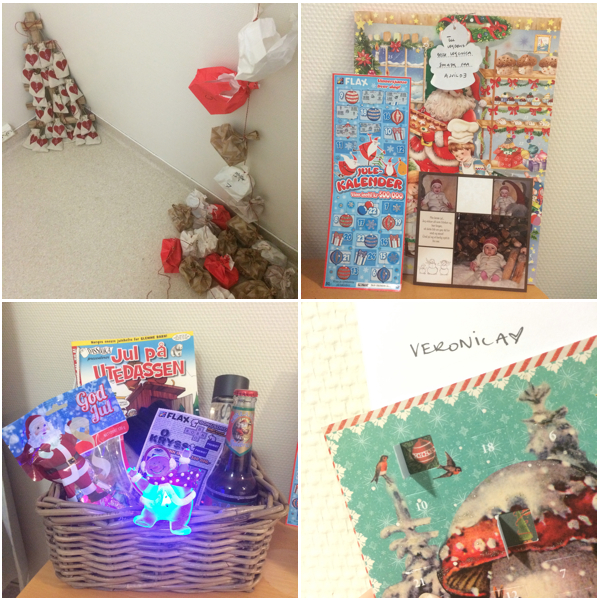 Noe som gjorde starten på alle desemberdagene mye bedre, var kalenderne jeg endte opp med. Fra min biologiske mor, fra mamma, fra tante og Alvilde, og fra en av mine bestevenninner. Jeg skal innrømme at det var en smule pinlig da jeg måtte svare “seks…” til de som spurte hvor mange jeg egentlig hadde i dette lille rommet. Jeg ble jo virkelig skjemt bort i år. Men så er det jo så utrolig koselig å våkne til, og så setter jeg så pris på disse menneskene som har ordnet dette for meg! Ei annen tante dukket plutselig opp med en hel kurv full av julesnadder også – så det skal ikke stå på folkene rundt meg. (Tusen takk, dere!)