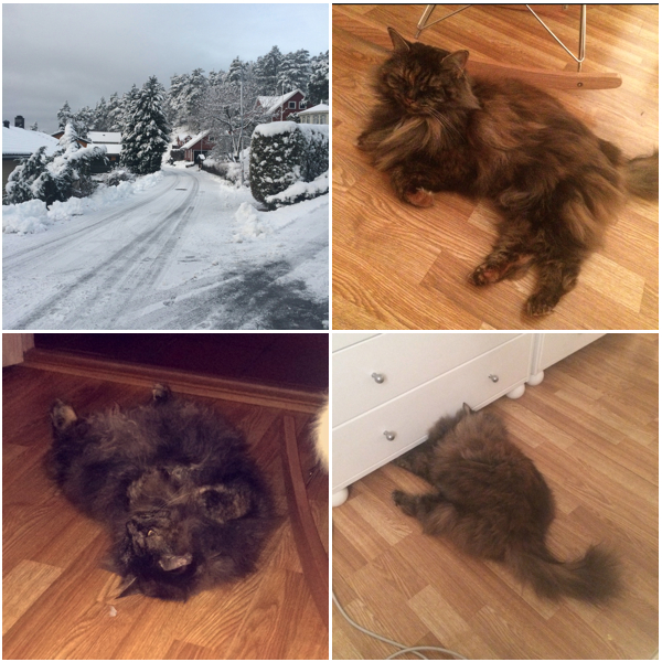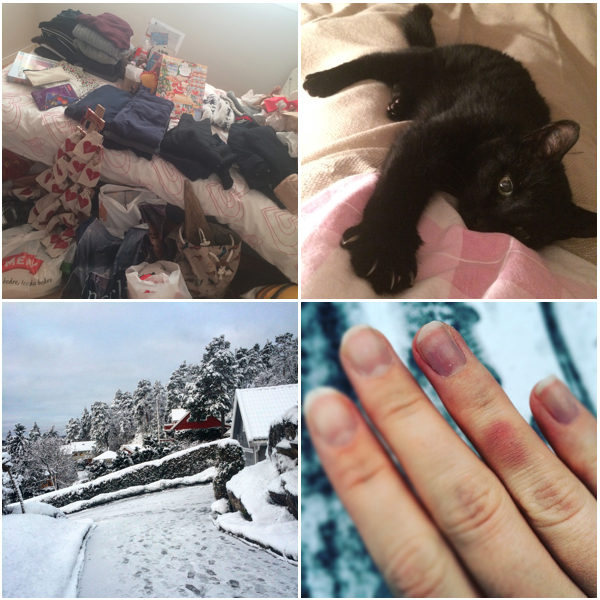 Så gikk nå dagene da, og etter en uke hos reservefamilien, pakket jeg “flyttelasset” mitt, kysset Samson på øret, og vendte snuten hjemover til hula mi. På vei hjemover fortalte jeg Trond at jeg ønsket meg snø, og til tross for hans uenighet, var det nettopp det jeg våknet opp til dagen etter. I den fjerde bilderuta har jeg liksom fylt inn noe så random som et par fingre. Men jeg har altså gått rundt med en glassbit i fingeren i over fire år, og på denne flotte snøværsdagen valgte tydeligvis denne glassbiten å pynte fingeren min med litt julefarge. Da vet dere det også.