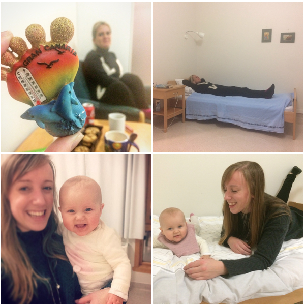 Flere ganger har jeg vært så heldig at jeg har fått besøk. To jobbtanter og en onkel har vært innom. På bildene ser dere også en kollega, som avleverte suvernirer og testet ut den harde tresenga – og glade lille Alvilde, som visst også endte opp med å teste den 😉